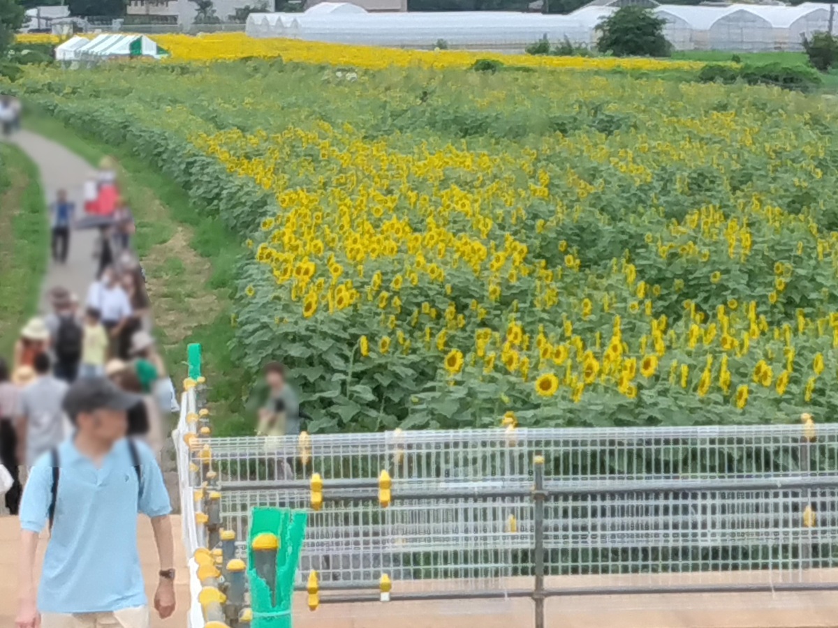 ひまわり畑の「ひまわり」、妻と一緒に見てきた。畑内に作られた道から見て回るのだが、平日ということもあり見物客もそれほど多くなく、渋滞して困るようなことは無かった。それから、昨年よりも、道幅が広くなっていたので通りやすかった。