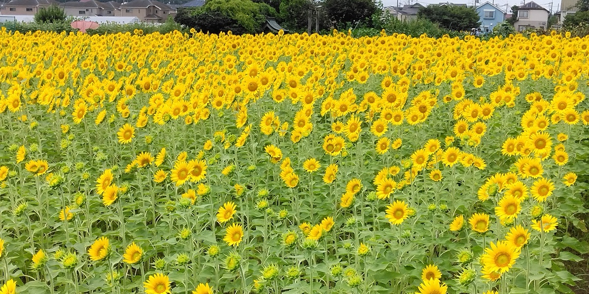 広範囲に写した左の写真の後方に、連続して黄色く見えるのが咲き誇っているひまわりで、右の写真がそれである
