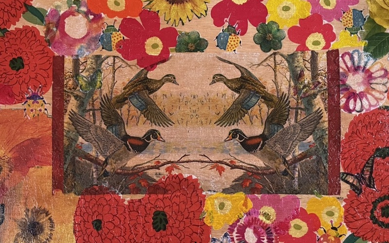 4羽の鳥(オシドリ)が花に囲まれていますが、その他にもこの絵の中に昆虫がいますがそれは何でしょうか?探してみては如何ですか