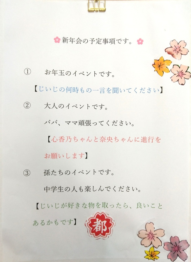 子供達との新年会、昨日孫たちも含めて総勢14人すべてが参集して行った。今回も景品付きのくじ引きとゲームを行い、大盛りあがりであった。孫たちと会う度ごとに、身長面、意識面そして運動能力面などで成長を実感している。そのような成長を見ることで、楽しみを味わさせて貰っているよ。勿論活力も。