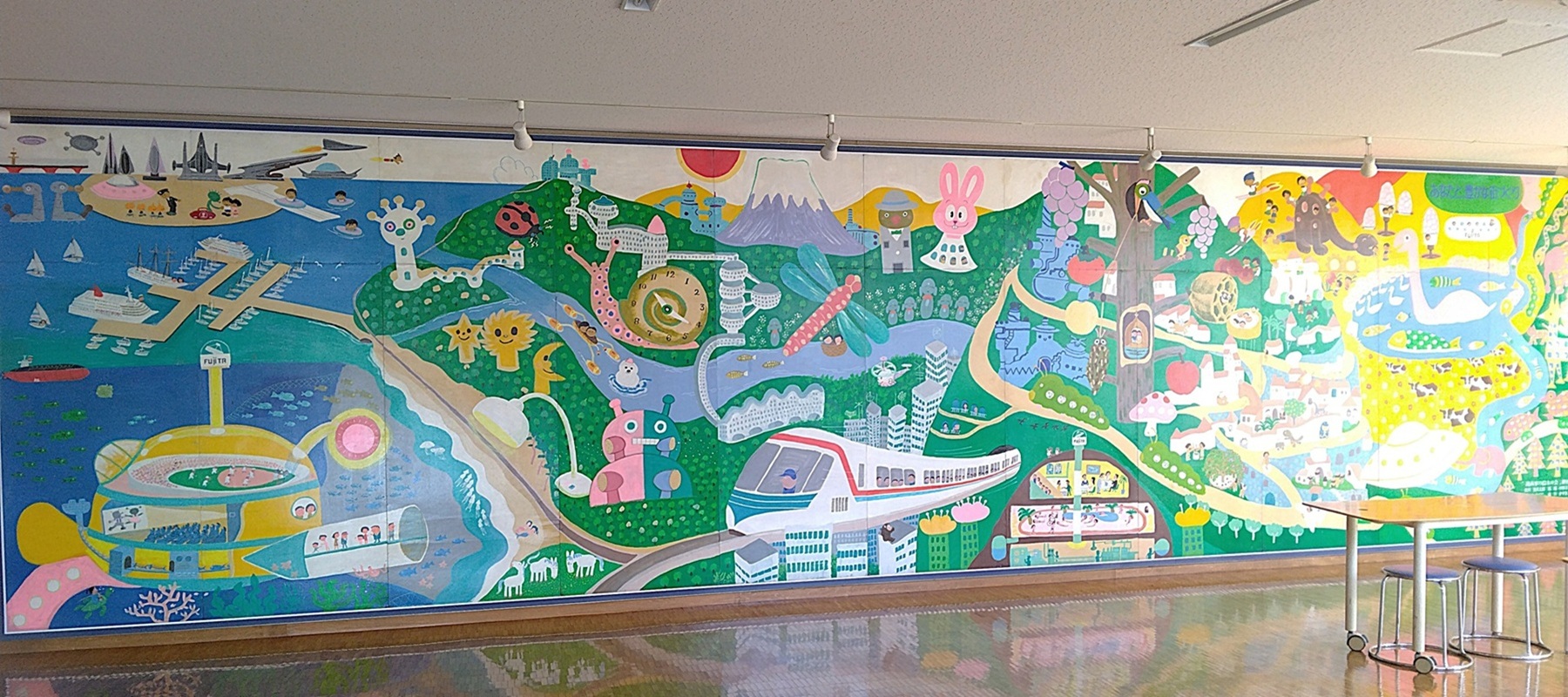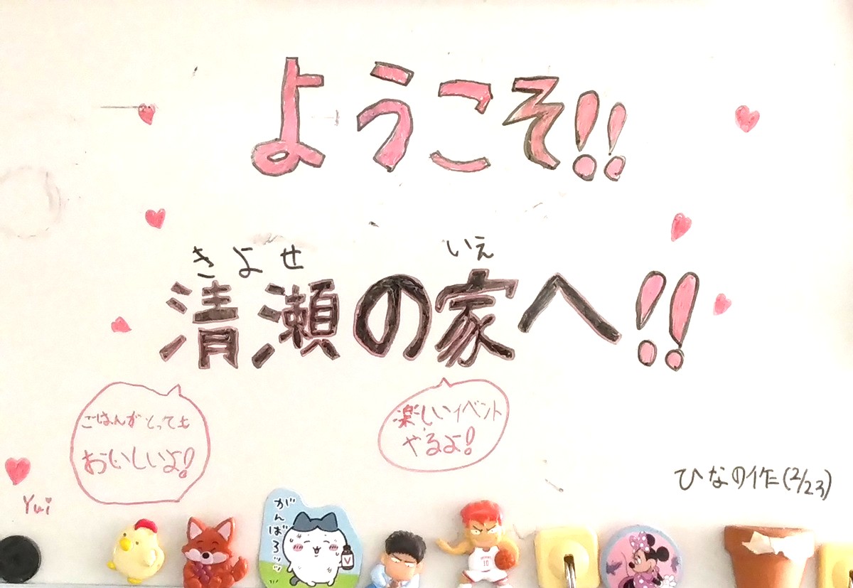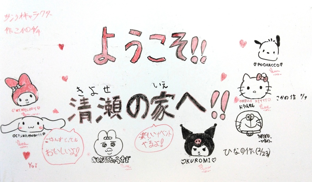 その時、白板に「ようこそ!!」を書いてくれたその白板に、その孫の姉が「キャラクター」を描いてくれた