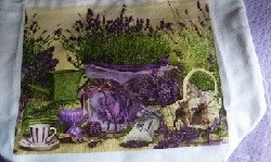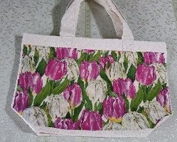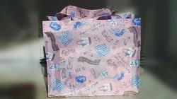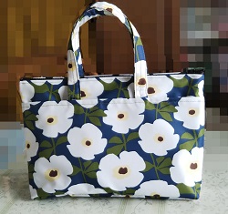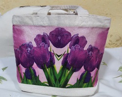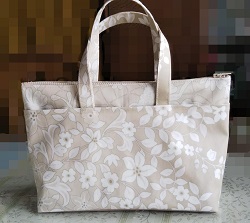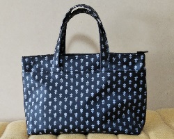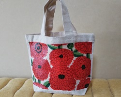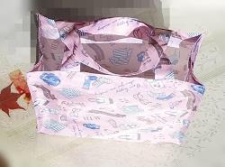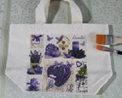 キャンパス生地の既成バッグに、ペーパーナプキンに絵柄を印刷した物を使用してデコバージュを施した