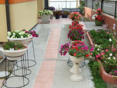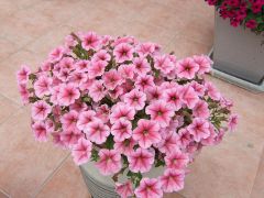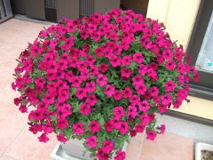 玄関前の鉢植えペチュニアは満開、花壇植えのペチュニアは未だ此れからの状態