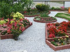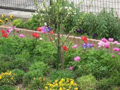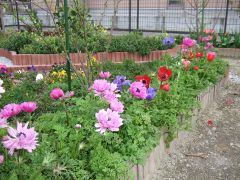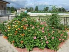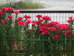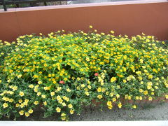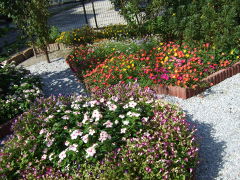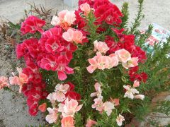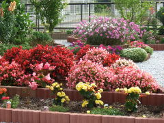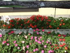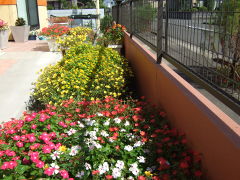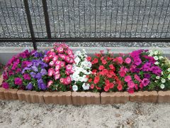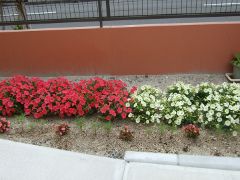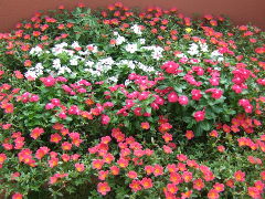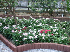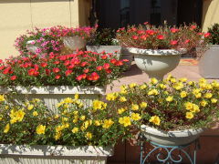 日々草(手前の赤・白色)とポーチュラカ(その後の黄色)