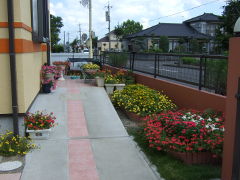 上記玄関前の花壇植えペチュニアが、沢山咲いたので、大分違っています その後ろはポーチュラカ