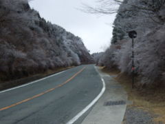 草千里ヶ浜から米塚へ向かう途中の樹木に雪が淡く掛っている風景