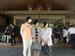 白水館の玄関前で、旅の思い出の記念撮影