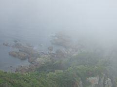佐多岬展望台から、霧がかかった海岸を見る。
