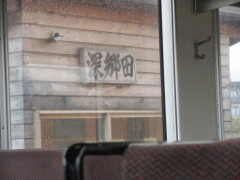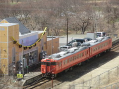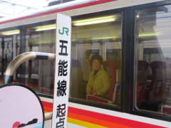 「金勇」を見学してから徒歩で駅に向い、着いたら既に「リゾートしらかみ号」がホームに到着していた。15分ほどの停車があり、ホームでは、バスケリンクにボールを入れるゲームが行われていた。乗客を楽しませるためのイベントであった。