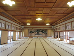大中小の間があり、小間や大広間(110畳:上右の写真)は廉価で貸出しをしている。大広間には音響装置がありコンサートで使われることもあるとのこと。天井も3尺X6尺の無垢の一枚杉を使っており見ものだった。