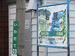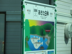 「あきた白神(しろかみ)駅」の案内板には、鰰(はたはた)が、「岩館(いわだて)駅」は、岩館海岸や鉄橋が描かれている 尚、ホームは岩館駅