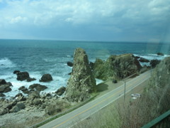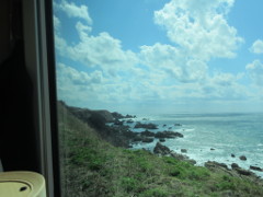 岩館駅を発車した後に見えた海岸線では、速度を落としての運転となり眺望しやすく、当日は、雨模様の予報であったが、通過時間の12時50分頃は晴れ間が有り、海と空のコントラストが夏を思わせる景観であった