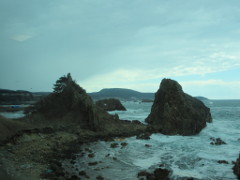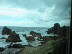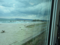 深浦駅から「広戸(ひろと)駅」を発車した後に見えた海岸線で、この区間も速度を落としての運転となり眺望しやすく、通過時間の13時37分頃は晴れ間があった