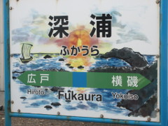 「深浦(ふかうら)駅」の案内板には、夕日、北前船(きたまえぶね)が描かれている 深浦は、江戸時代から明治時代に寄港地となっていたようだ