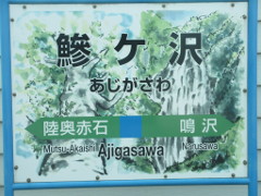 「鯵ヶ沢(あじがさわ)駅」の案内板には、右側に滝が描かれているが、これは「くろくまの滝」と思われる、左側に描かれているのは、北限の天然すぎと思われる