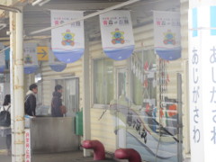 鯵ヶ沢駅のホームの建物の壁には、イカ釣船(鯵ヶ沢丸)が描かれている 風物詩として、海岸沿いのイカのカーテン(イカを吊るように干す)があるようで、その場所は「焼きイカ通り」と呼ばれているようだ