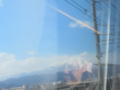 最後の写真となるが、写っているのは「岩手山(いわてさん)」と思われる ガラスに反射した後席が写り、山の姿が少々ぼけてしまった 盛岡駅に到着する4分前の14時40分撮影