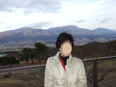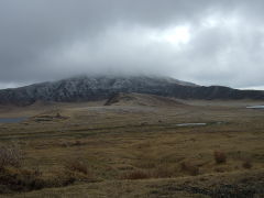 草千里ヶ浜の後ろに、雲が掛り、雪で少し白くなった烏帽子岳をみる