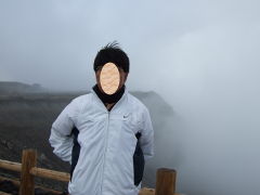 中岳の火口西から見える、第1火口(噴煙中)の前にて