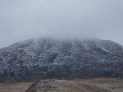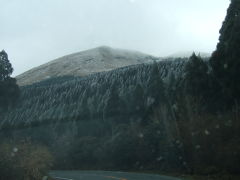阿蘇パノラマラインを走行中に、淡い雪が掛った杵島岳をみる