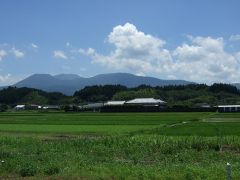改札口を入ったところから見た田園風景、遠目に三つの頂きを持つ山並みを見ることが出来た 左から「甑岳(こしきだけ)」1301m、 「韓国岳(からくにだけ)」1700m、「白鳥山(しらとりやま)」(中央)1363m