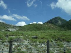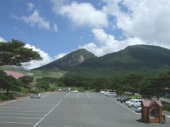 「えびの高原」のレストラン2階から見た「韓国岳」 鹿児島県と宮崎県の県境付近に位置する霧島火山群の最高峰 注:火口縁北西部に爆裂火口があり火口縁が分断されたため、えびの高原から見るとピークが2つ有るようにみえるのが特徴