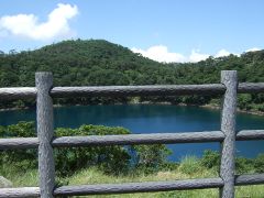 「えびの高原」にある、県道沿いから見える「不動池」 池の直径200mで、酸性度が高くコバルトブルー色に映り綺麗である