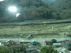 バス内から、初狩PA先辺りで中央本線の電車を見る