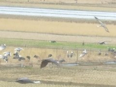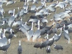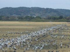 田圃の畦道に群がるマナヅル、ナベヅル等の群れ