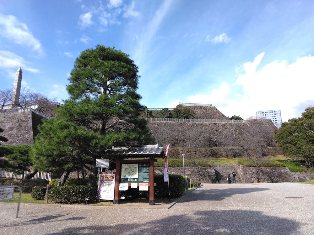 中央に台形が見えるが、その場所が、甲府城の天守が建っていた処である 「Japanese garden」 「You can see a trapezoid in the center, which is where the main keep of Kofu Castle once stood.」