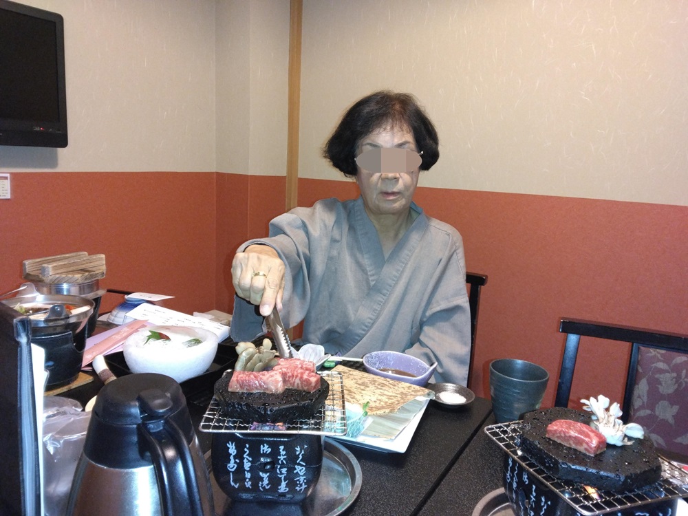 溶岩焼きで、盤上の肉をひっくり返そうとしている