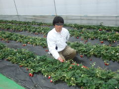栃木県岩舟町にある、食べ放題のイチゴ農園で、食べる前の大きなイチゴを持って