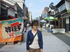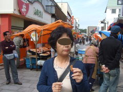 輪島朝市の入口付近にて試食のスルメを手にしています