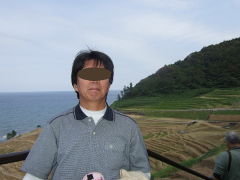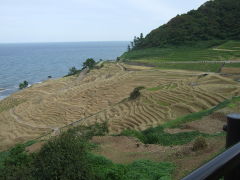棚田の「白米千枚田」(しろよねせんまいだ)をバックに